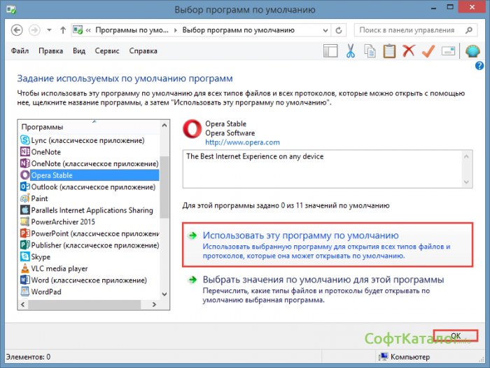 6. И последний наш вариант, это из уже установленных браузеров выбрать тот самый единственный. Для этого в Windows 8 /10 зайдем вНастройки Панель управления Программы по умолчанию нажимем пункт Задание программ по умолчанию, после чего находим в списке нужный нам браузер и устанавливаем его по дефолту.