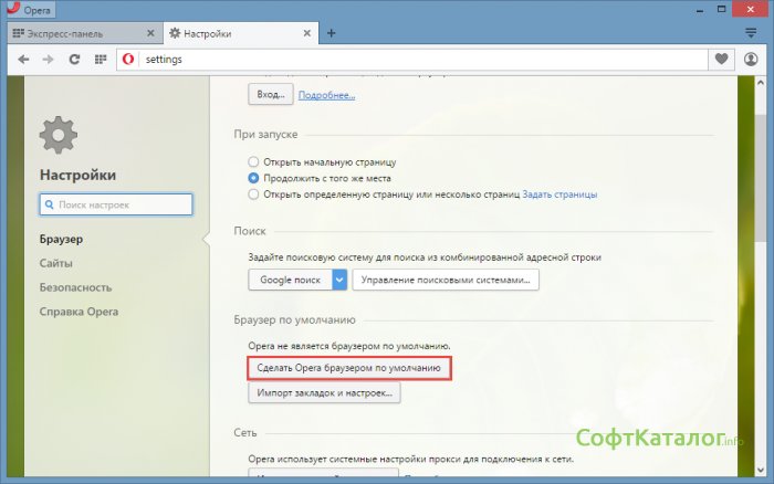 1. Для того, чтобы назначить браузер Opera браузером по-умолчанию, нужно зайти в Настройки и нажать кнопку.