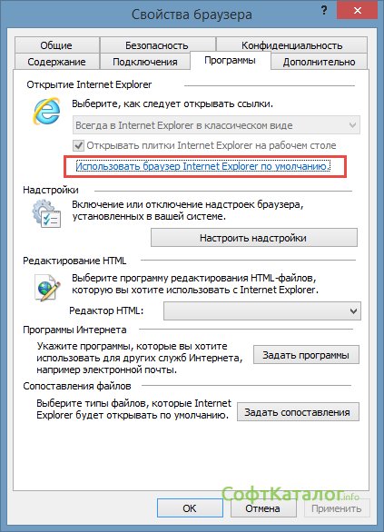 5. Ну и конечно же всеми любимый Internet Explorer. Заходим в пункт Свойства браузера, далее переходим на вкладку Программы и нажимаем ссылку.