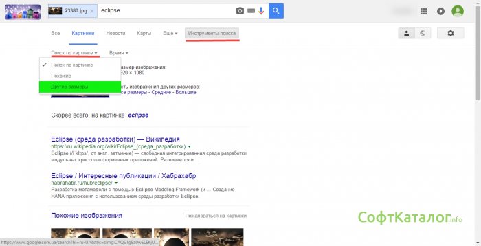 Когда поисковая система нашла нужный файл, можно попробовать найти эту же картинку, но уже с более большим разрешением и размерами. Для этого нажмем Инструменты поиска Поиск по картинке Другие размеры.