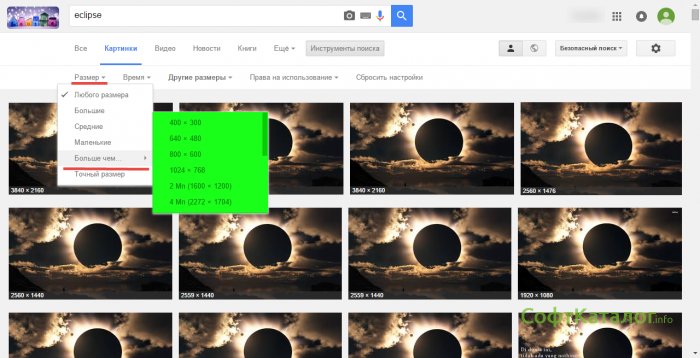 Начнется поиск вашего изображения, но уже в большем размере. Если найденные вам размеры не подходят, то можно выбрать в пункте Размер Больше чем… и найти тот который вам нужен.