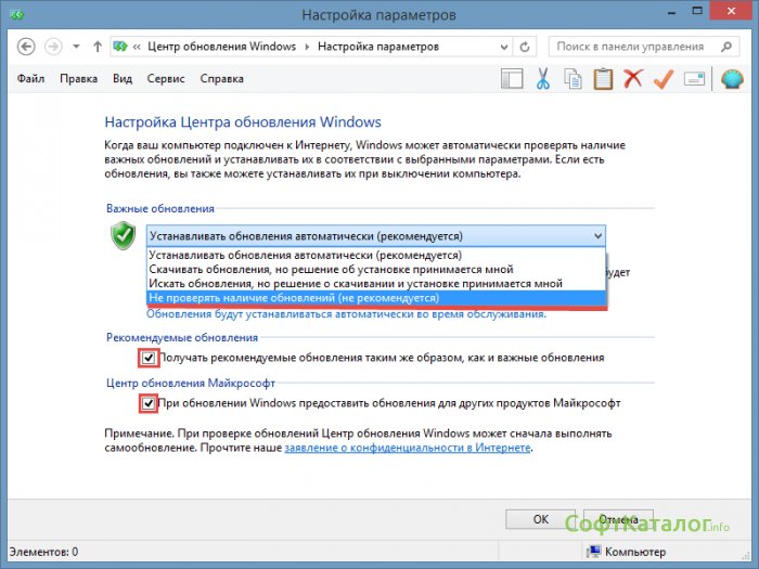 6. После этого нажмем на выпадающий список и выставим значение Не проверять наличие обновлений (не рекомендуется), после чего снимаем все галочки и нажимаем кнопку .