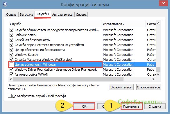 Нажимаем сочетание клавиш Win+R и вводим команду msconfig, жмем — запустится окно Конфигурация системы. В нем мы заходим на вкладку Службы и ищем службу Центр обновления Windows, снимаем с нее галочку и нажимаем кнопку , затем и перегружаем операционную систему.