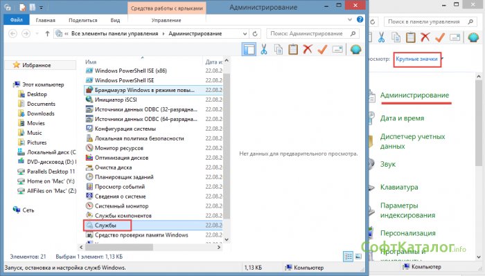 Зайдем в Панель Управления найдем пункт Администрирование, но для этого нужно нажать на пиктограмме Просмотр и выбрать Мелкие значки, только после этого вы увидите нужный пункт. Зайдя в этот пункт найдем Службы и запустим их двойным нажатием мыши.