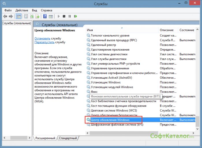 Откроется окно со списком разных служб. Та служба, которая нам нужна, находится в самом низу: Центр обновления Windows.