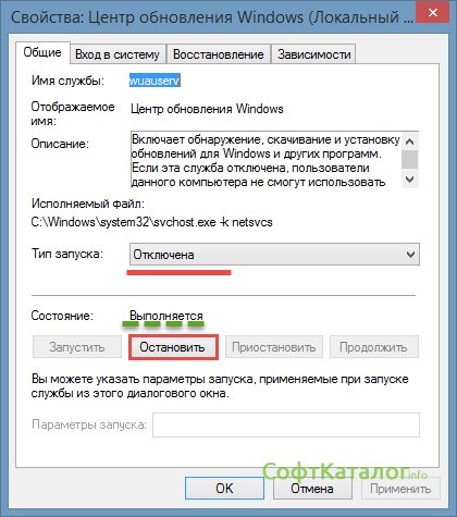 Нажав правой кнопкой мыши на нужной нам службе и выбрав пункт Свойства откроется окно, в котором мы, собственно, должны посмотреть в каком состоянии находиться служба, Выполняется или Остановлена. Если состояние Выполняется, значит нажимаем кнопку Остановить – служба остановится. После этого нажмем и перегружаем наш компьютер.