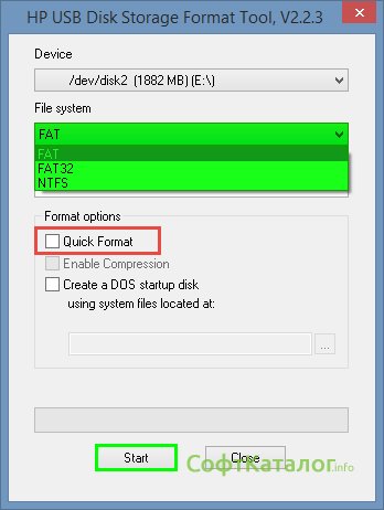 Программу для форматирования HP USB Format Storage можно скачать из интернета. Как ей пользоваться показано на скриншоте ниже. Выбираем файловую систему ставим галочку Quick Format и жмем .