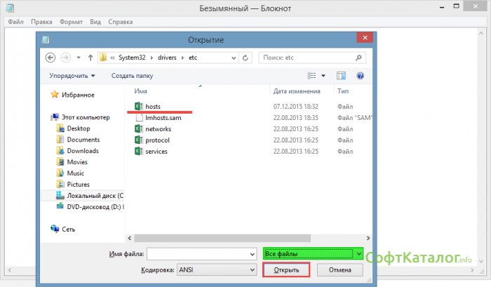 После этого нужно нажать сочетание клавиш Ctrl+O и выбрать нужный нам файл, обязательно перед этим выбрав "Все файлы, а не только текстовые". Иначе файл хост мы не увидим.