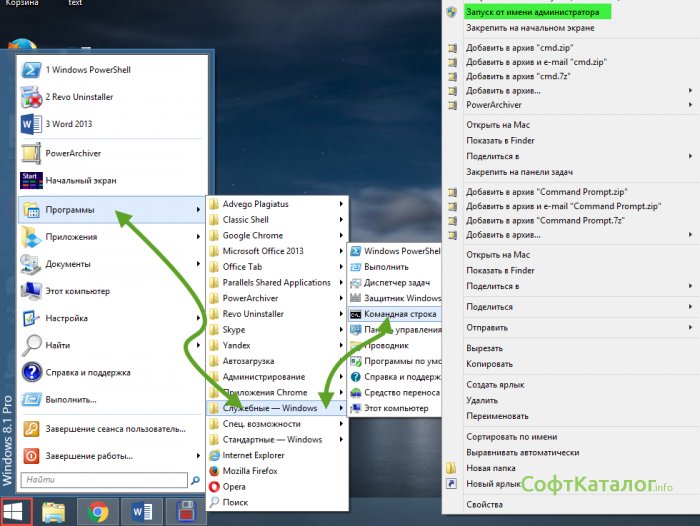Еще вариант - запустить командную строку от имени администратора. Нажимаем Программы Служебные, после чего нажимаем правой кнопкой по пункту Командная строка и выбираем в контекстном меню Запустить от имени администратора.