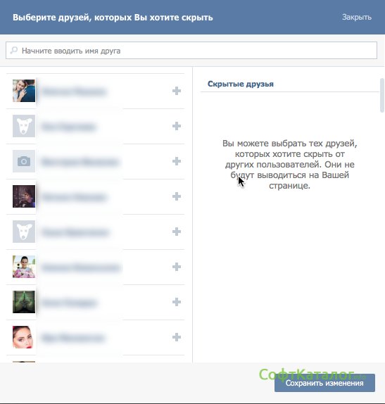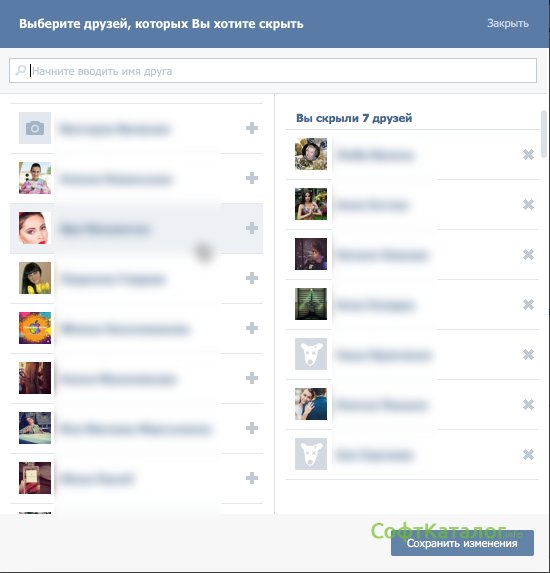 Откроется окно разделенное на две половины. Слева будут друзья которых видят все, а справа скрытые.