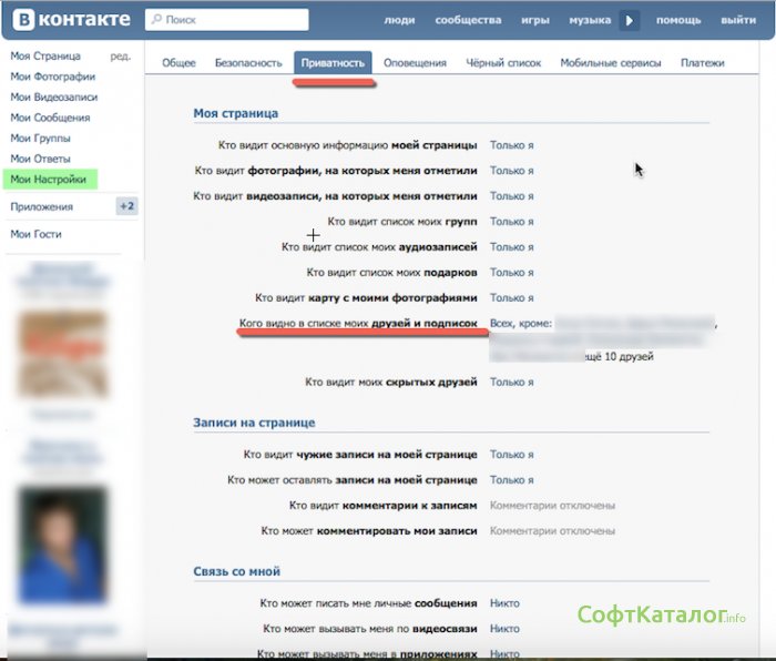 Для того, чтобы скрыть ваших друзей от посторонних глаз в социальной сети Вконтакте, зайдем в Мои настройки, перейдем на вкладку Приватность, в ней найдем пункт Кого видно в списке моих друзей и подписок и нажмем на надпись .