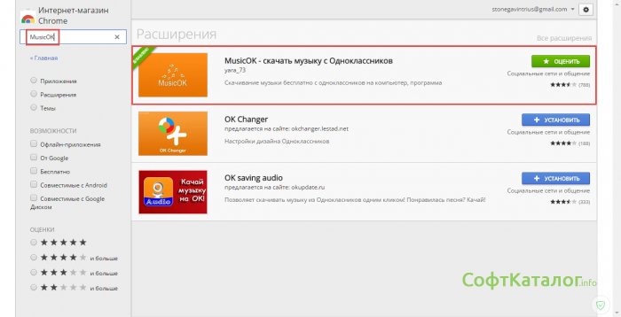 Внизу станицы находим кнопку Еще расширения и нажимаем ее. В открывшемся окне в строке поиска пишем MusicOK (Он нам поможет скачивать музыку) и нажимаем . Перед нами будет несколько плагинов, мы вибираем бесплатный плагин для Одноклассников. После жмем кнопку установить.