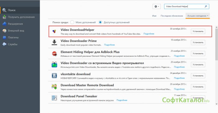 Если вы пользуетесь Mozilla Firefox - для него качаем плагин Video Download Helper – ничего, что в названии плагина явно указано что он качает видеофайлы из социальной сети, он также очень хорошо скачивает и песни. Для его установки нам понадобиться зайти в настройки браузера и выбрать пункт Дополнения, после чего в троке поиска ввести искомый плагин и установить его.