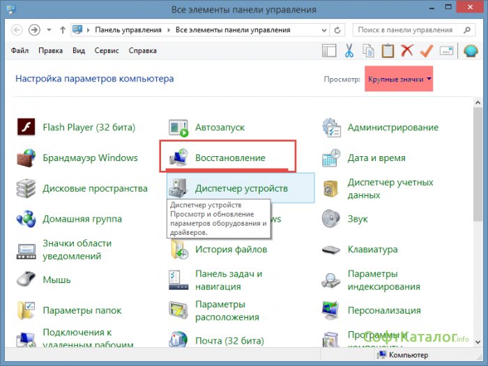 Первым делом заходим в Настройка Панель управления и находим пункт Восстановление.