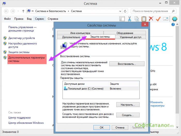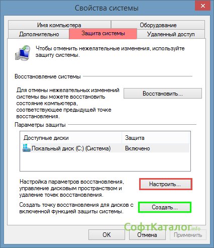 В открывшемся окне на вкладке Защита системы есть кнопки: