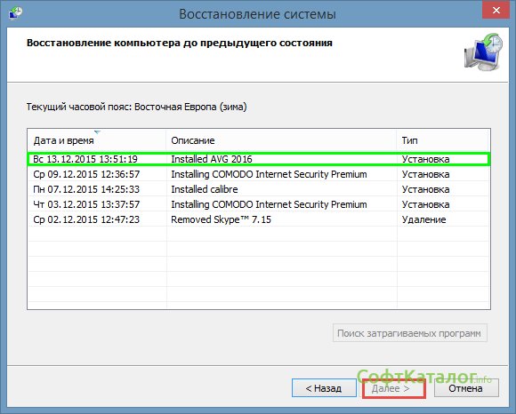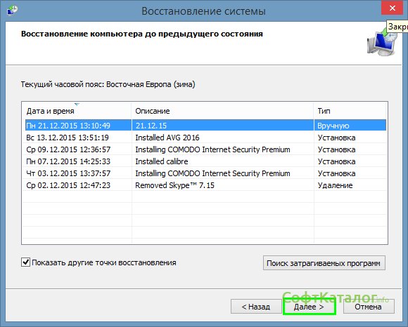 Восстановиться вы сможете в соответствующем пункте данной программы. Происходит восстановление также на интуитивном уровне – нужно выбрать точку восстановления и нажать кнопку .