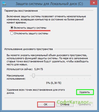 Настроить – в этом пункте вы можете включить или отключить защиту системы, выбрать какое количество дискового пространства можно использовать под точки восстановления либо удалить все точки восстановления (это поможет вам освободить много места на вашем ПК). Но делайте это с умом, иначе откатиться на нужную дату у вас потом может и не получиться.