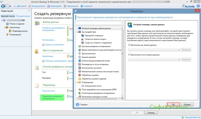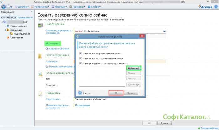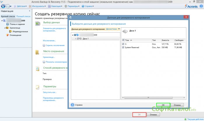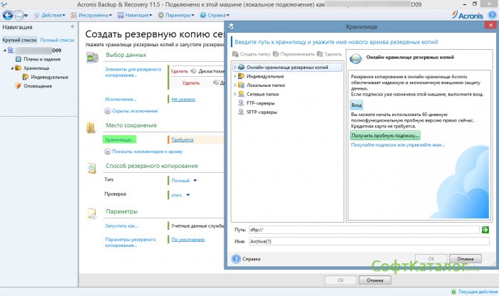 Ниже есть меню Хранилище. Так как программа очень универсальная, то здесь можно хранить резервные копии вашей ОС не только локально, а и удаленно, например на вашем FTP-сервере. Также поддерживается облачное хранилище. После того как выбрали хранилище идем дальше к параметрам.
