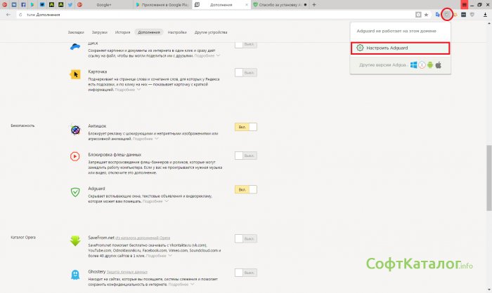 После активации удаления рекламы его лучше дополнительно настроить. В верхнем углу найдите серый или зеленый значок блокировщика и нажмите на него. Выбирайте пункт Настроить Adguard.