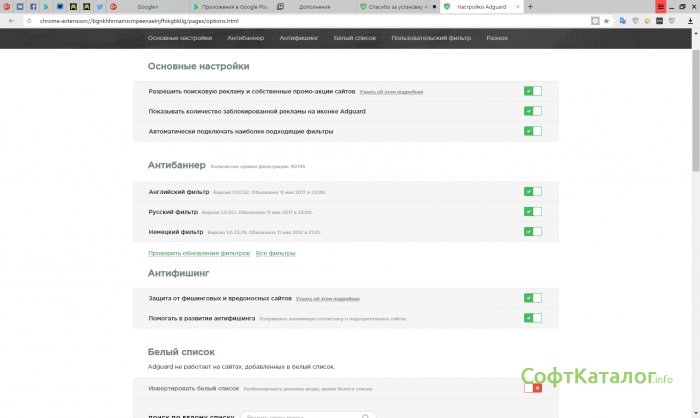 Антибаннер уже сконфигурирован, но по умолчанию реклама на некоторых сайтах разрешена. Чтобы избавиться от неё, настройте плагин так же, как на нашем изображении – это самый простой способ.