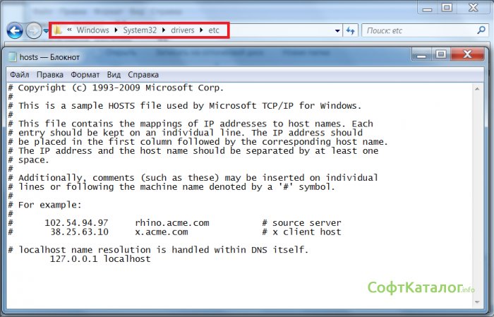Если отключить рекламу в Яндекс Браузере с помощью мануала не удалось, вам необходимо проверить компьютер на вирусы и очистить файл hosts от лишних строк. Путь к нему и правильное содержание (файл открывается блокнотом) показаны ниже.