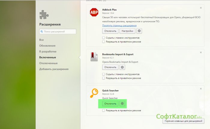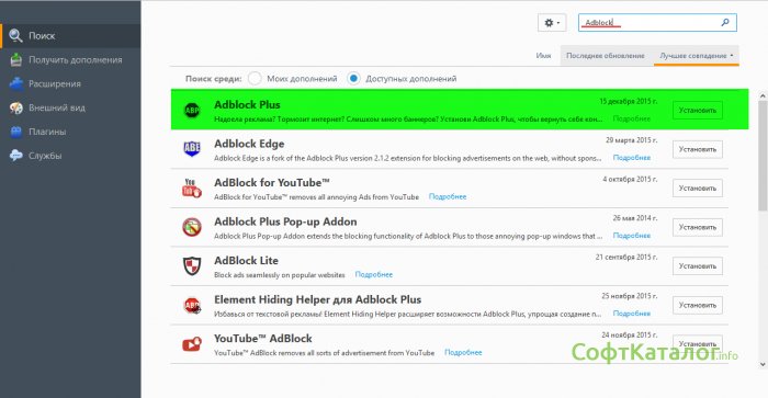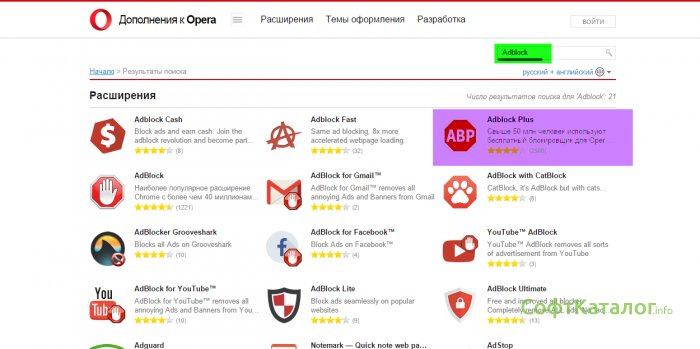 Для браузера Opera – производим аналогичные манипуляции: заходим в настройки, затем в Загрузка расширений. В строке поиска прописываем Adblock и устанавливаем найденное дополнение. После того как оно установилось, нажимаем и избавляемся от рекламы.
