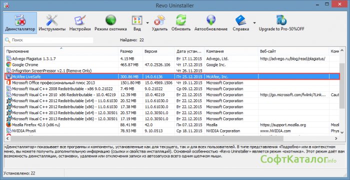 2. Следующий способ — это удаление MacAfee с помощью программы стороннего разработчика. Возьмём Revo Uninstller. После запуска программы в открывшемся окне выбираем антивирус и нажимаем по нему два раза левой кнопкой мыши или один раз правой кнопкой мыши, затем выбираем пункт Деинсталляция.