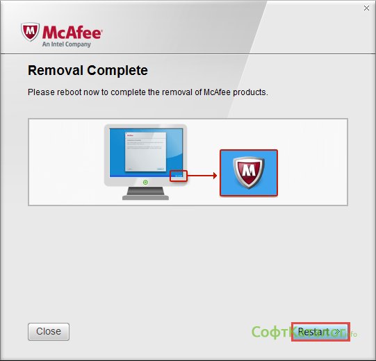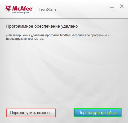 Когда программа удалит все компоненты антивируса McAfee, она предложит перезагрузить компьютер – жмем кнопку .