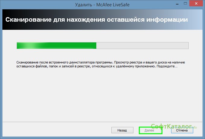 В программе Revo Uninstller жмем и она сканирует ваш компьютер на наличие остатков от антивируса McAfee.