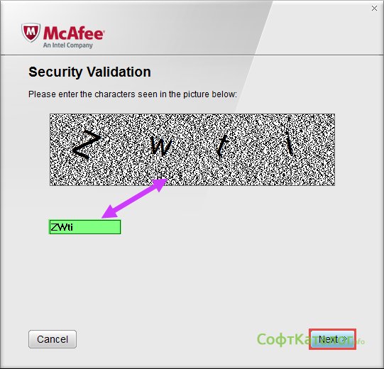 Программа попросит ввести код с картинки. Вводим его и нажимаем - начнется удаление всех программных комплексов от компании McAfee.