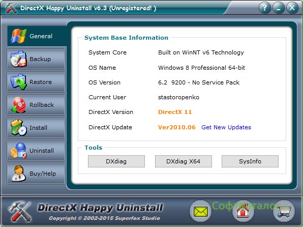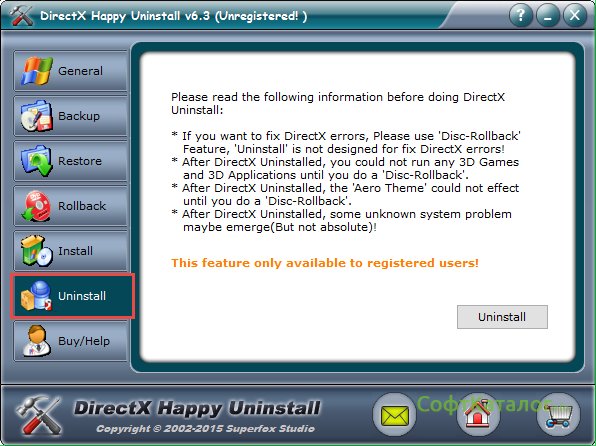 DirectX Happy Uninstall – понадобится нам если вы используете Windows 7 /8. Запустим программу, она нам покажет всю информацию об установленнам на компьютре DirectX (в нашем случае установлен DirectX 11), после этого зайдем в пункт Uninstall и нажмем кнопку . Программа произведет удаление DirectX. Перезагружаем компьютер и устанавливаем новую версию.