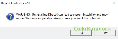 DX Eradicator – только для Windows XP и windows 2000/2003. После запуска программы вы увидите окшко, в котором написано предупреждение о том, что удаление может негативно повлиять на работу операционной системы. Нажимаем кнопку и начнется удаление комплекса DrectX. В этом случае так же как и в предыдущем, нужно будет перезагрузить ваш ПК, после чего установить новую версию Directx.