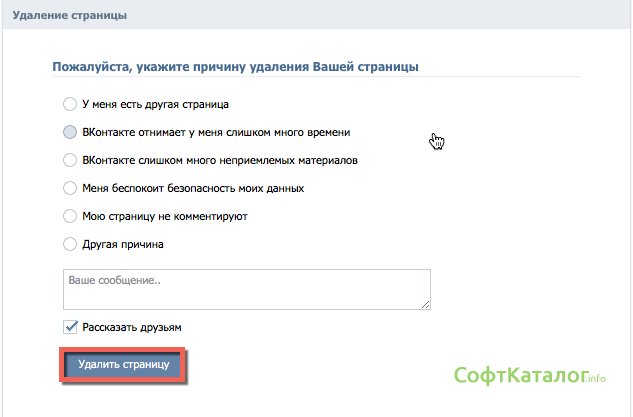 После нажатия у вас откроется окошко с параметрами удаления. В нем указываете причину почему вы хотите удалить страницу. При удалении можно поставить галочку Рассказать друзьям - она предупредит друзей о том что вы покинули социальную сеть.