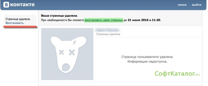 После того как вы нажмете кнопку , откроется окно с информацией об удаленной странице. Если вы захотите передумать и восстановить страничку в социальной сети вконтакте, вам укажут сроки в которые вы сможете это сделать без потери данных.