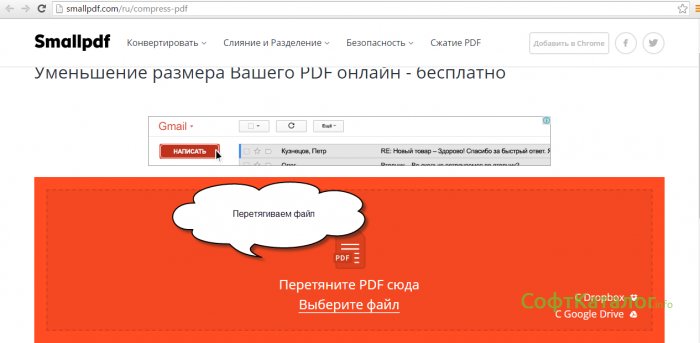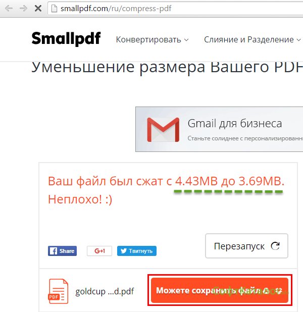 2. Для того чтобы сжать файл с помощью Web-сервисов, нужно зайти, например, на сайт http://smallpdf.com/ru/compress-pdf и перетащить ваш pdf файл в поле, указанное на сайте. После того как файл был перенесен и сжат, вам выдадут окно о завершении сжатия и укажут из какого и до какого размера удалось сжать файл. Нажимаем кнопку и получаем ваш pdf файл, но уже с другим размером.