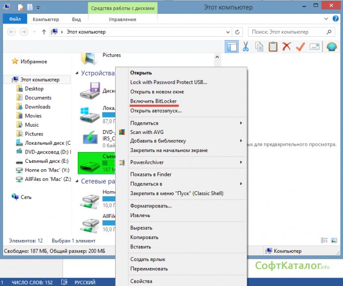 Для этого зайдем в Мой компьютер и выберем нашу флешку. Нажмем по ней правой кнопкой мыши и выберем пункт Включить BitLocker.