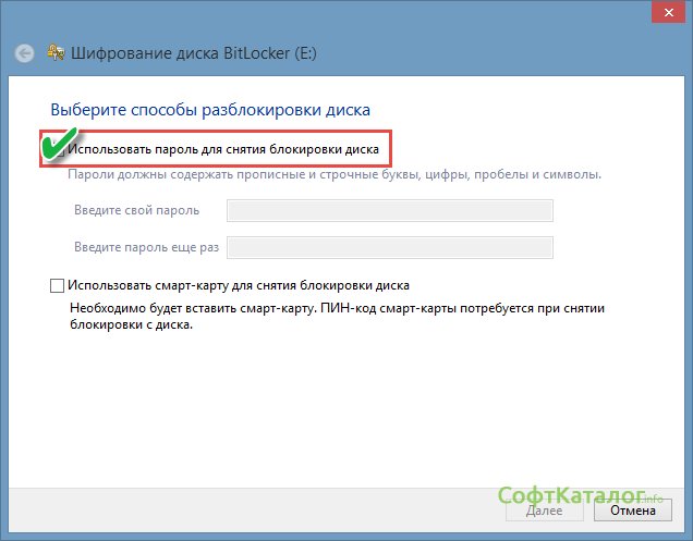 Ставим галочку напротив пункта Использовать пароль для снятия блокировки диска. Пароль 111 – не подходит, нужно придумать что-то посложнее.