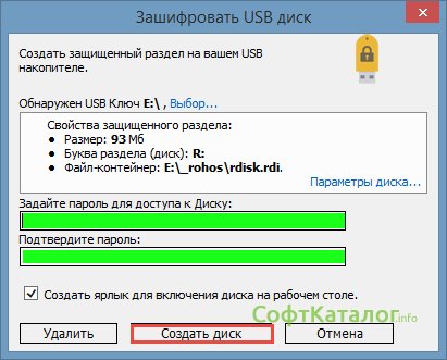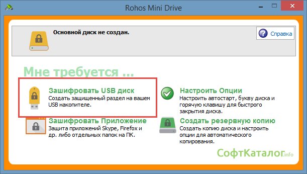 3. Воспользуемся еще одной программой стороннего разработчика – Rohos Mini Drive. При запуске программа предложит вам зашифровать USB накопитель, посмотреть опции или создать копию носителя. Если есть на флешке какой-то портативный софт, то есть возможность зашифровать именно его. В программе есть и такая функция.