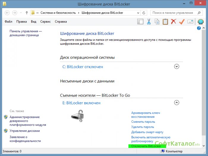 Для отключения BitLocker нужно нажать правой кнопкой мыши по вашей флешке и выбрать Управление Bitlocker, и здесь нажать кнопку .
