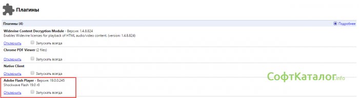 В окне с плагинами находим Adobe Flash Player и включаем его.