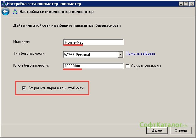 В этом окне нужно ввести название вашей сети и ключ безопасного подключения к ней. Не забываем поставить галочку Сохранить параметры этой сети и нажимаем