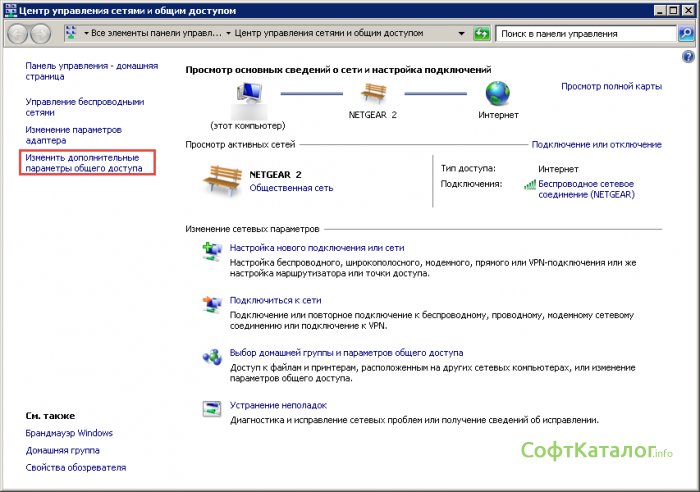 Теперь перейдем к настройкам общего доступа. Для этого зайдем в Центр управления сетями и общим доступом