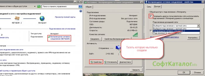 Создастся сеть с именем Home-Net и паролем 88888888, но нам еще понадобится сделать так, чтобы эта сеть видела интернет. Для этого мы заходим настройки нашего сетевого адаптера, к котороу подключен интернет, выбираем нашу сеть и нажимаем кнопку . В свойствах отмечаем галочку Разрешить другим пользователям сети подключение к Интернету данного компьютера и чуть ниже из выпадающего списка выбираем сеть, которую мы создали. Она будет выглядеть как сетевое подключение 2. Нажимаем кнопку .