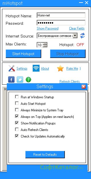 После запуска программа предложит вам выбрать настройки сети, то есть ее имя и пароль. Вводим нужные данные, после чего нажмем кнопку и наслаждаемся интернетом с вашего ноутбука на других устройствах.