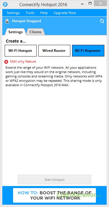 На последок разберем платную программу под названием Connectify – программа имеет чуть больше настроек и возможностей чем выше описанные. При первом запуске Connectify предлогает, в зависимости от ваших требований, выбор: сделать ваш пк точкой доступа (Hotspot) или роутером (Wired Router), либо же повторителем (Wi-Fi repeater). Мы выбираем что нам нужно и интуитивно настраиваем как в предыдущих программах. Обратим внимание на то, что эта программа плохо работает с Windows 7.