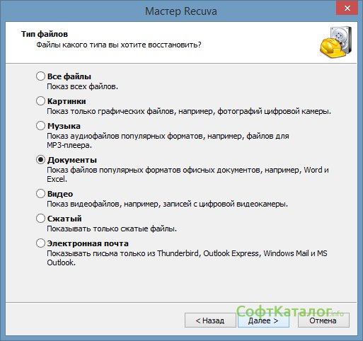 При запуске программы выбираем тип файла, который мы удалили, после чего жмем и выбираем носитель с которого был удален этот файл.