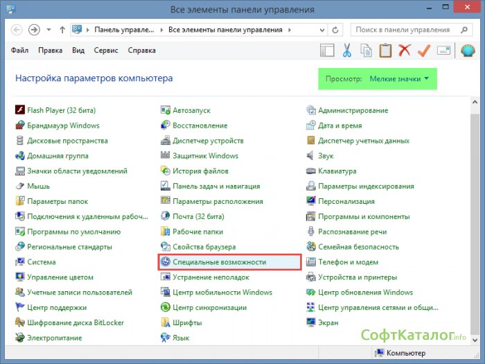 В открывшемся окне "Все элементы управления", выбираем режим просмотра Мелкие значки и находим пункт Специальные возможности.