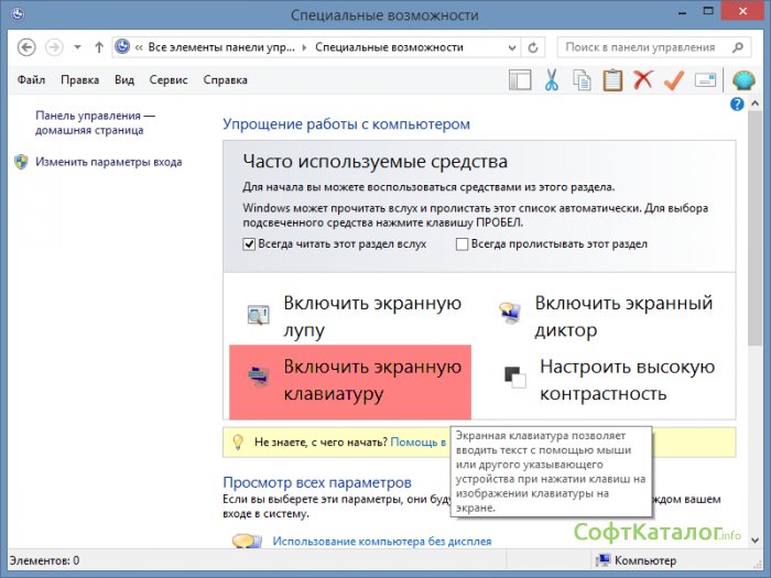 Откроется окно с большим количеством функций, облегчающих работу с компьютером. В основном это меню позволяет полноценно работать с компьютером людям с ограниченными способностями. Находим тут пункт Включить экранную клавиатуру и нажимаем по ней левой кнопкой мыши.