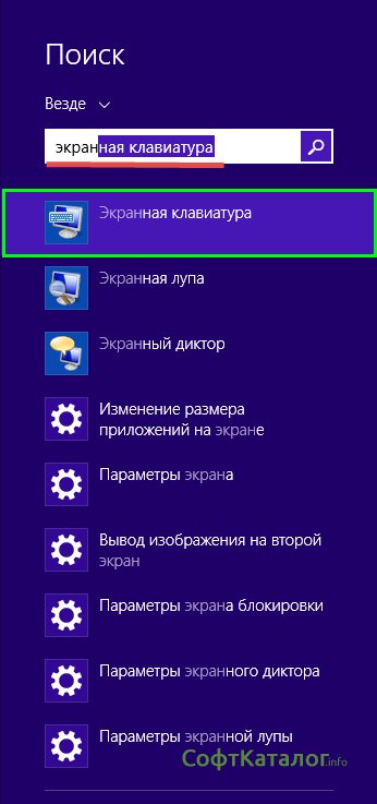 Последний способ, который мы рассмотрим, доступен в Windows 8 и выше. Для его исполнения достаточно провести по правой части экрана сверху вниз мышью и в поиске ввести "экранная клавиатура".