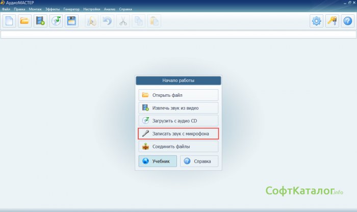 2. Если же вам понадобится записать файл в другом формате, воспользуйтесь для этого программой для записи звука с микрофона - АудиоМастер. Программа очень функциональна, в ней можно как записать, так и отредактировать ранее записанные аудио файлы любых форматов. Рассмотрим как записать звук с микрофона. Для этого найдем соответствующий пункт и нажмем .